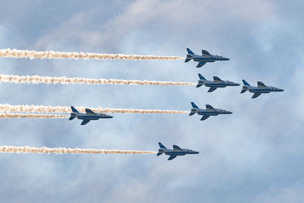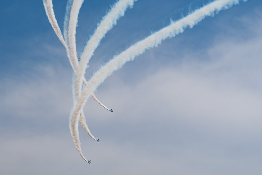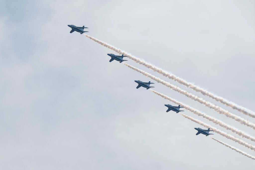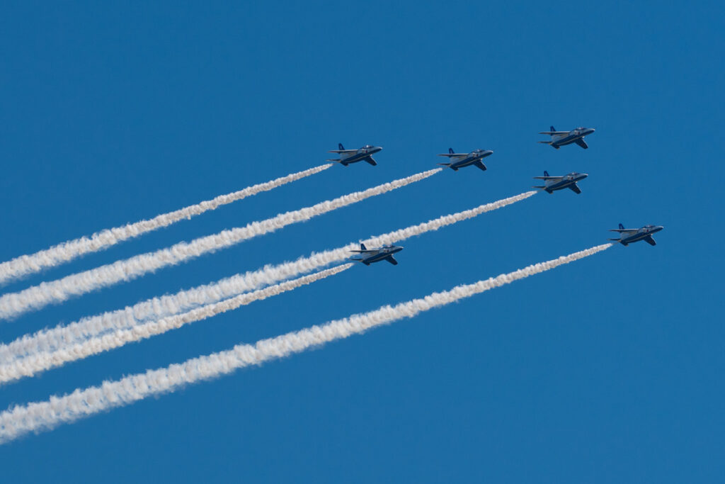 2025年10月8日2026年3月5日Blog by yoichiブルーインパルス 滋賀国体閉会式所々雲はありますが青い空が広がる絶好のブルーインパルス日和の日。もちろん午前中に有給を確保し、カメラを持って彦根へ向かいました。しかし、展示飛行時間は3分。前日に飛行ルートの情報も無しの状況でいったい何をするのか?そして何処を飛ぶのか?と何もわからない。前日に行われた予行の情報もあったけど何処で撮影をするのがいいのかむむむ…となり、絵としては彦根城を絡めて撮りたい。しかしルートが違えば何処にも展開出来なくなる。何処にすると悩みながら無難に何処を飛んでも見れる場所に陣取りました。yoichi Website https://libre.jp
