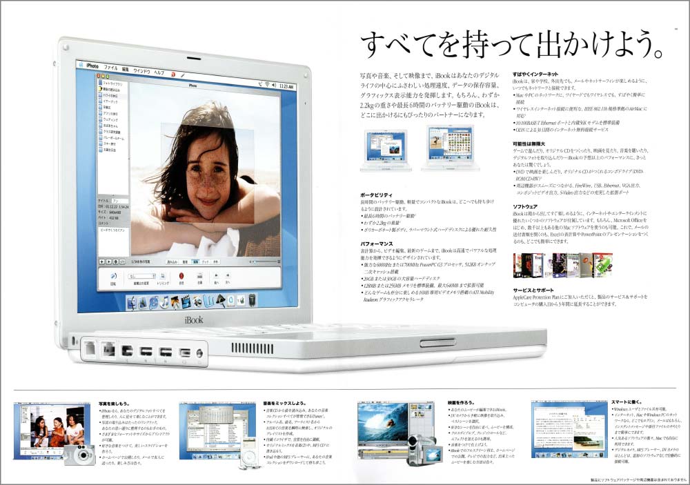 中面は本体の写真を大きく配置し上段右側に特長を、ラインを挟んで下段には写真、音楽、映像の扱い易さとWindowsとのファイル共有について説明されています。写真、音楽、映像については現在もiPhoto、iTunes、iMoveと現在もMac OSの代表的なアプリケーションとなっていて、Appleが当時から力を入れていた事がわかります。