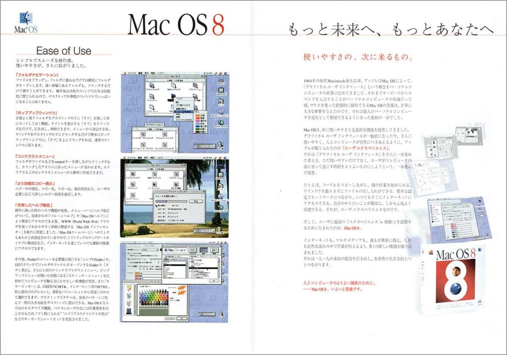 Mac OSが漢字Takeから、名前もシステムも一気に進化したバージョンになります。この頃パソコンブームもあり、このMac OS 8も発売日の深夜0時になった瞬間から販売が開始されました。もちろんMacユーザーの私も深夜に日本橋に向かい、販売店が配っていたアップルジュースを飲みながら販売開始を待ったのは懐かしい思い出です。