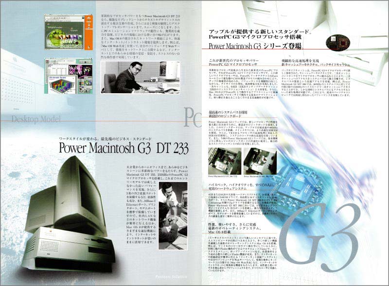 全体のページは片観音折6ページ構成で、折り返し部分にはPowerPC G3の説明や筐体のアクセスの容易性、Mac OS 8の事などが書かれています。折り返しを開いた3ページでは、1ページづつDT233、DT266、MT266が本体の写真とコピーが入り、各モデルのターゲット層へ向けてアピールされています。
