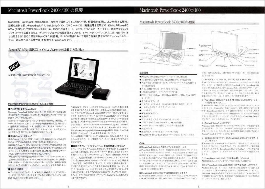 中面開きには、Power Book2400c/180の概要と外観図、仕様と販売店向けと言う事もありQ&Aも掲載されています。主な特徴としてはスペックよりも軽量が先に来ており、日本ユーザーから強く上がっていた軽量化に答えたハードだと言えます。