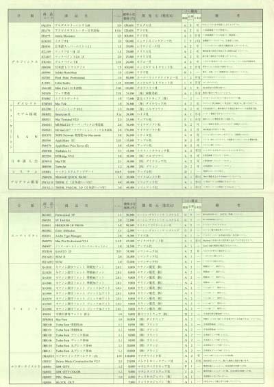 キャノン販売が発行した「マッキントッシュソフトウェア価格表」です。この頃は旧来からのキャノン販売のルートとアップルからの販売とが有り、価格表が両社から発行されている時がありました。