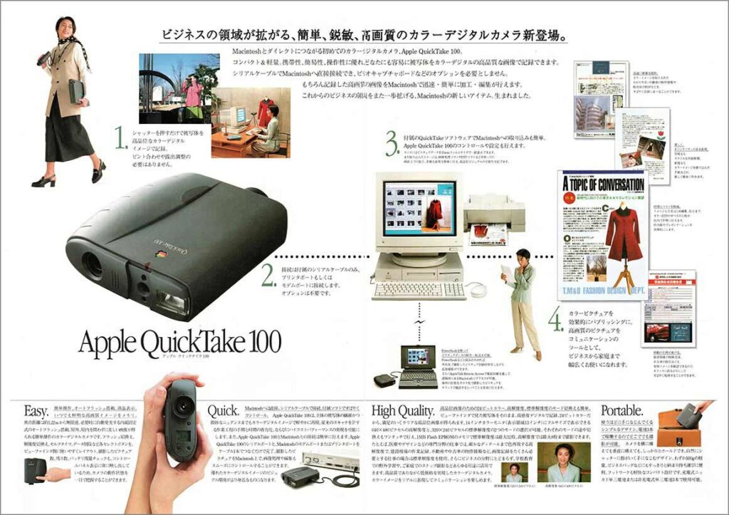 表紙は、実にAppleらしいシンプルだけどインパクトがあるデザインで、続く中面ではビジネスでの利用方法を中心に何が出来るのかと、扱いやすさ、画像のクオリティが紹介されています。画像のクオリティとしては、標準解像度(320×240ピクセル)、高解像度(640×480ピクセル)の24ビットカラーとなっています。記録メディアは1MB Flash EPROM(1MBですよ)で、標準解像度で最大32枚と当時としては十分のスペックでした。
