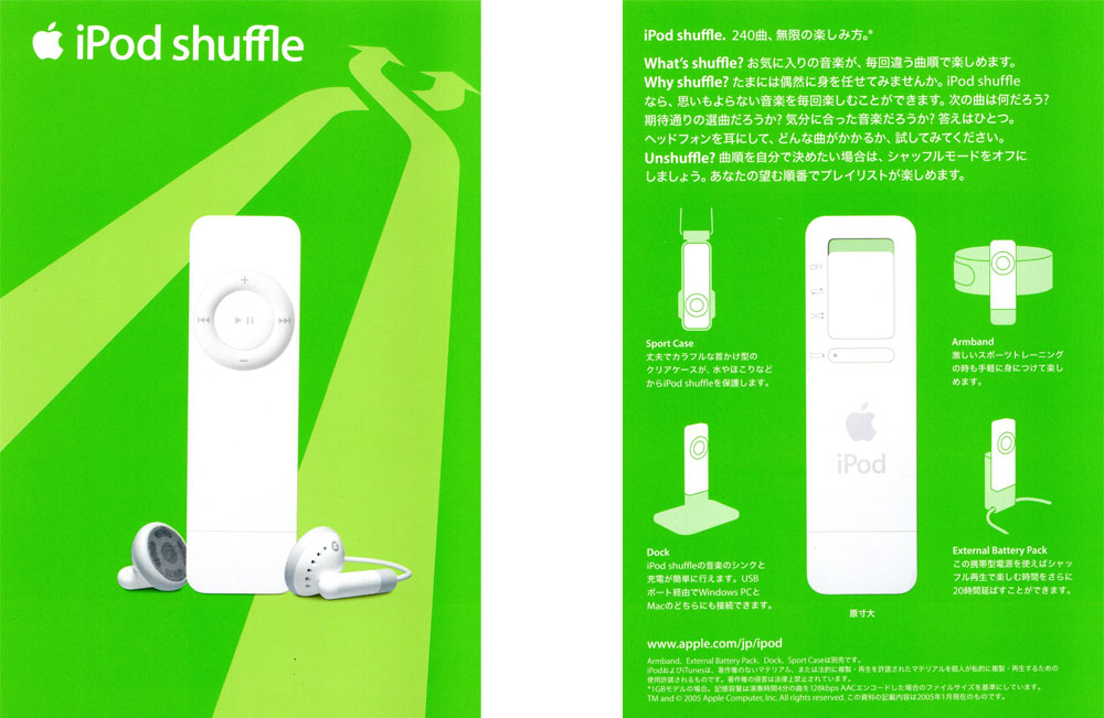 このiPod shuffleのカード以降このフォーマットで多数の印刷物が登場し、アップルストアのテーブルの上で見る事ができる様になる。現在印刷物は殆ど無い状態なので、当時の様なカラフルで凝った印刷物があった頃が懐かしい。