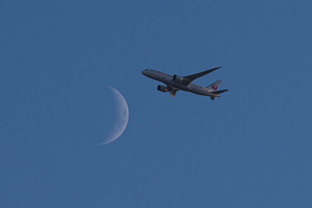 数ヶ月ぶりの千里川です。公園や駐車場、土手の整備も進んだ事で来られる方も増えて賑やかになった千里川の土手で夕方から日没まで撮影をしました。月にかかった飛行機は何便も粘って粘って偶然撮れた一枚です。